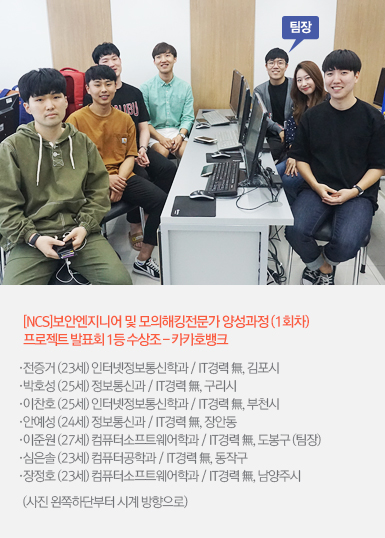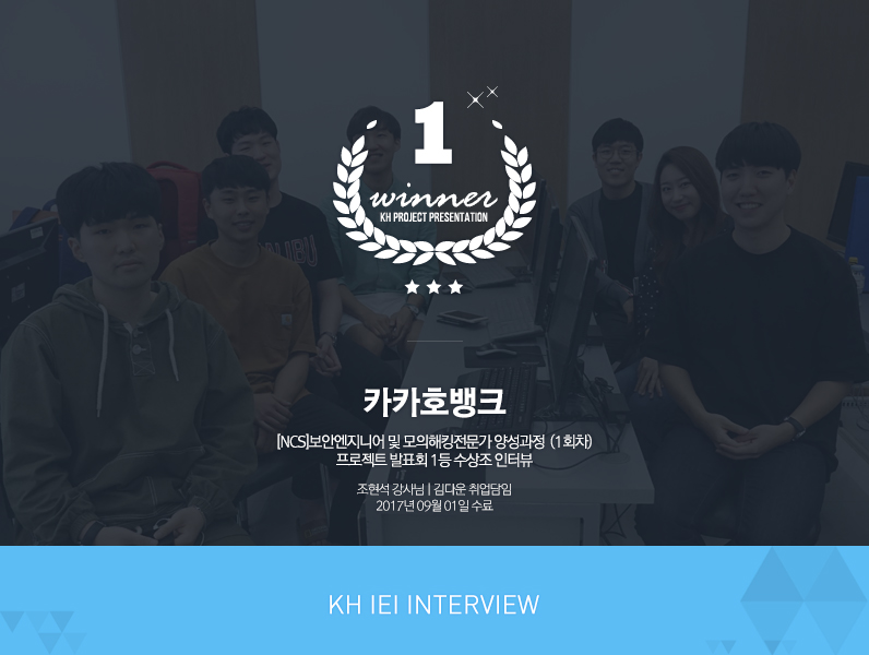 | 이준원 | 네! 안녕하세요. 저희는 은행 앱 '카카오뱅크' 을 벤치마킹한 '카카호뱅크' 팀입니다. 팀원이 많다 보니 네트워크 설정업체 '준트워크'와 보안컨설팅 업체 '찬랩'으로 나눠서 프로젝트를 구현했습니다. |