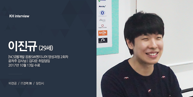 안녕하세요! 저는 당진에서 올라온 29살 이진규입니다. 저는 원래 경제학과를 전공했어요. 전공에 관련된 시험을 2년 동안 준비했는데 시원하게 떨어졌어요.(웃음) 그래서 학교를 중퇴를 하고, 자바에 관심이 생겨서 KH정보교육원에 오게 됐습니다,