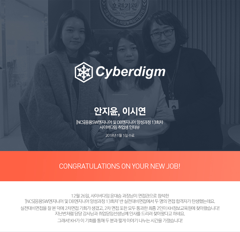 실전대비면접이 실제 기업면접으로 이어지는 사례가 흔한 케이스는 아닌데, 두 분이 열심히 공부한 흔적과 열정이 윤대승 과장님 눈에 더 띄었나 봅니다. 같은 팀으로 입사 동기가 된 만큼, 서로에게 많이 의지하고 배워갈 수 있길 KH가 응원하겠습니다!