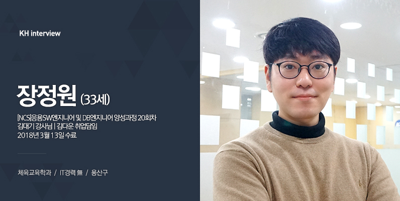 안녕하세요! 33살 장정원입니다. 체육교육학과를 졸업했는데, 다양한 경로를 거쳐 조금 색다른 분야인 IT에 도전하게 되었습니다.