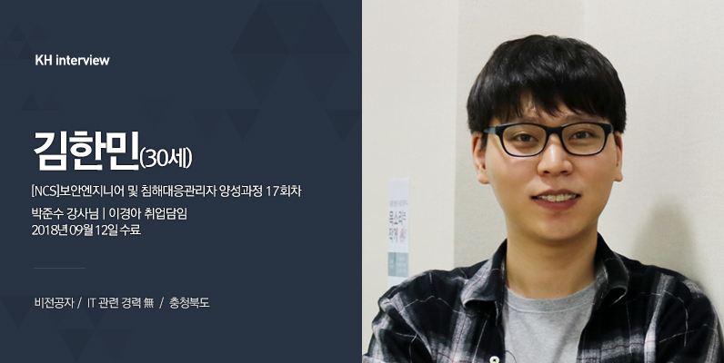 제가 공무원 준비를 했었는데, 잘 안되더라고요. 그러다가 취업성공패키지를 알게 됐어요. 상담하러 갔는데 4차 산업도 발달하고, 앞으로도 지속적으로 발달할 거라고 IT를 강력추천해주시더라고요. 그래서 IT를 알아보다가 정보보안을 알게 됐는데, 바이러스를 막고 백신으로 보완하는 부분이 너무 매력이 있더라고요. 그래서 정보보안을 선택하게 됐습니다.