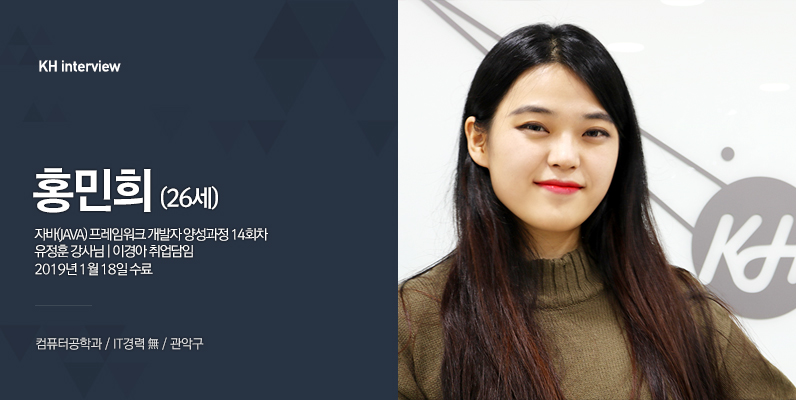 입학상담을 받을 때, KH의 커리큘럼이 마음에 들었습니다. 커리큘럼이 체계적이고 탄탄해서 이대로 따라간다면 실력이 많이 향상될 것 같은 기대가 생겼죠. (웃음) 또, 홈페이지를 확인해봤는데 최우수훈련기관으로 인증을 받은 기관이라는 것을 보고 신뢰할 수 있었습니다.