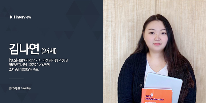 안녕하세요. 저는 광진구에 살고 있는 24살 김나연입니다. 현재 [NCS]정보처리산업기사 과정평가형 과정B 수업을 듣고 있습니다.