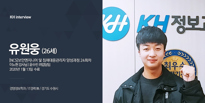 안녕하세요. 저는 26살 유원웅이라고 합니다. 경영정보학과를 전공하다가 보안에 관심이 생겨 KH정보교육원에 등록을 하고 드디어 수료를 하게 됐습니다!