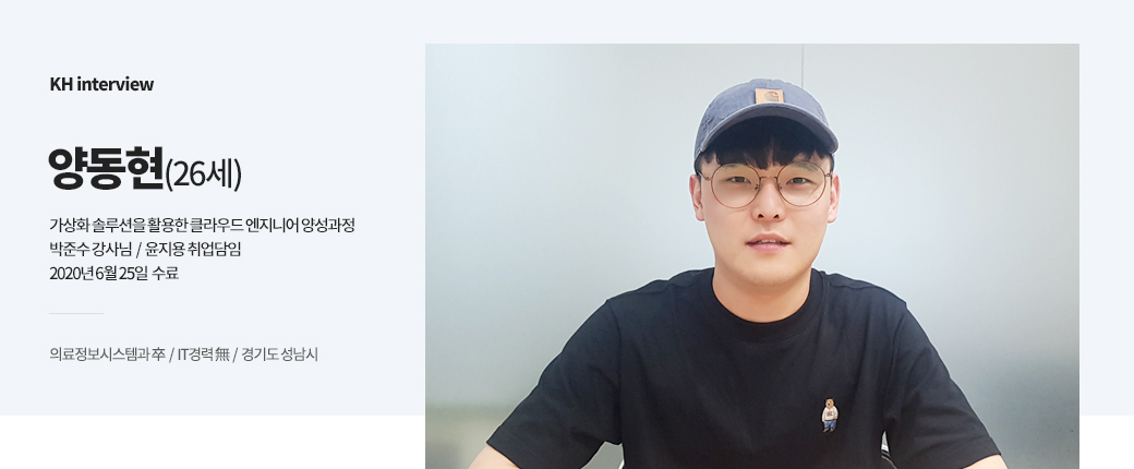 네 안녕하세요. 의료정보시스템을 전공한 26살 양동현이라고 합니다. 처음에는 아무것도 모른 상태로 KH에 왔는데 지금은 전공자들과 어깨를 나란히 할 만큼 실력 있는 당찬 비전공자입니다. (웃음)