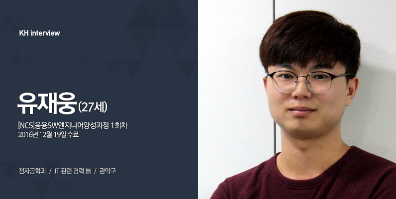 안녕하십니까! 27살 유재웅입니다. 전자공학과를 졸업했지만 소프트웨어에 대한 실무 공부를 하고 싶었어요. 그래서 관련 학원을 찾다가 고용노동부에서 주최하는 취업성공패키지를 통해 KH정보교육원에 오게 되었습니다.