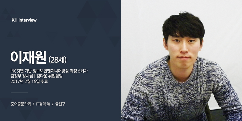 안녕하세요. 28살 이재원이라고 합니다. 중어중문학과를 전공했지만 전문적인 일을 하고 싶어서 고민 끝에 진로를 변경하게 되었습니다. 새롭게 도전할 곳을 찾다가 KH정보교육원을 통해서 정보보안 엔지니어 과정을 수강하게 되었어요.