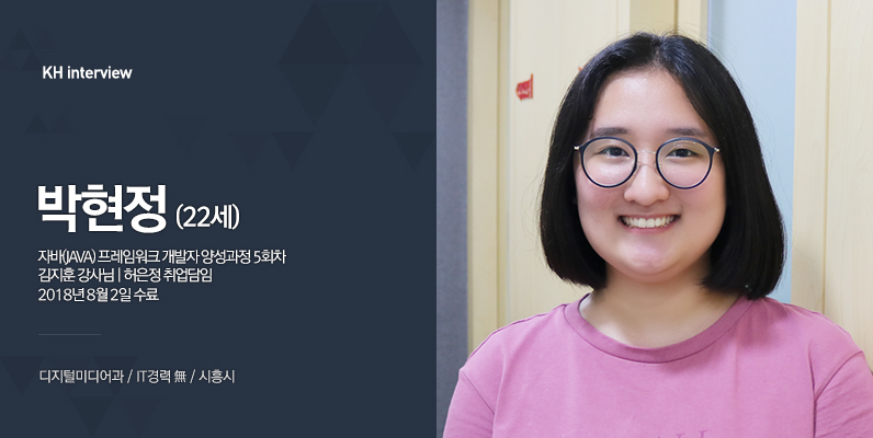 반갑습니다! 지금 막 자바프레임워크 개발자 과정 수료를 마치고 온 22살 박현정입니다.(웃음) 저는 디지털미디어 전공인데요. 학교에서는 웹개발보다는 웹디자인 중심 수업이었기 때문에, 개발 위주로 가르쳐주는 학원을 찾아오게 되었어요.