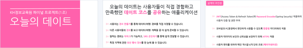 오늘의 데이트는 사용자들이 직접 경험하고 만족했던 데이트 코스를 공유하는 애플리케이션 입니다. 사용자는 핀 만들기를 통해 데이트(여행) 경로를 직접 지정할 수 있습니다. 다른 사용자들의 핀을 보고 데이트(여행) 계획을 좀 더 쉽게 준비할 수 있습니다. 원하는 핀은 북마크가 가능하고, SNS 공유하기를 통해 쉽게 전달할 수 있습니다. 특정 지역에 관한 최신 행사 정보를 한 눈에 볼 수 있습니다. |