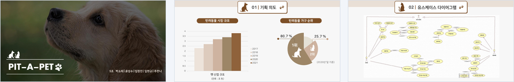 펫 산업 규모가 약 4조 가량에 달하고 반려 동물과 함께 사는 가구 수가 계속해서 증가하고 있는 요즘 시대에 맞게 반려 동물 관련 굿즈 판매 사이트를 제작하여 판매 수익금을 기부하고, 커뮤니티를 통해 반려인들 간의 소통 및 유기 동물 보호 시설의 정보를 제공하는 사이트를 제작한다. |