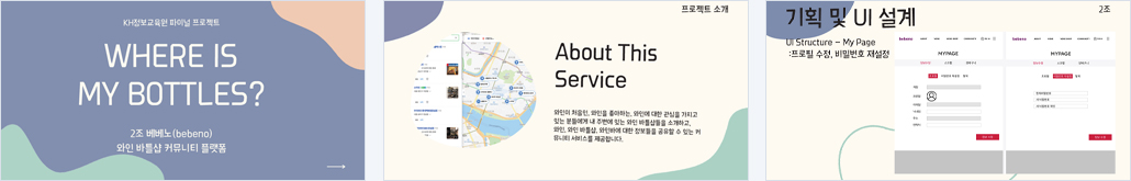 (1)프로젝트 컨셉: 와인정보제공 및 거래 페이지 (2)주요기능: 회원가입 -> 로그인 -> 와인정보 -> 와인샵 -> 와인커뮤니티 -> 마이페이지 -> 결제페이지 |